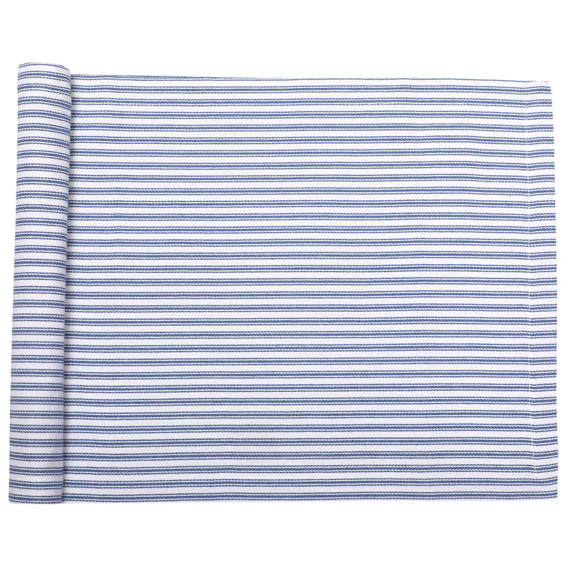 Prydd av ett randigt mönster i gråblått och vitt, en neutral löpare som passar alla tillfällen.