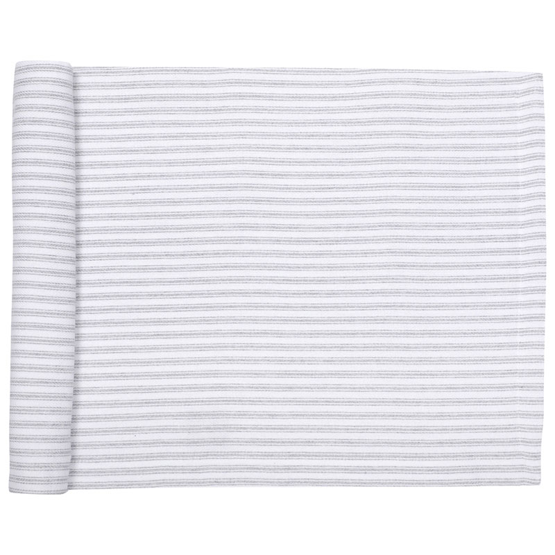 Prydd av ett randigt mönster i ljusgrått och vitt, en neutral löpare som passar alla tillfällen.