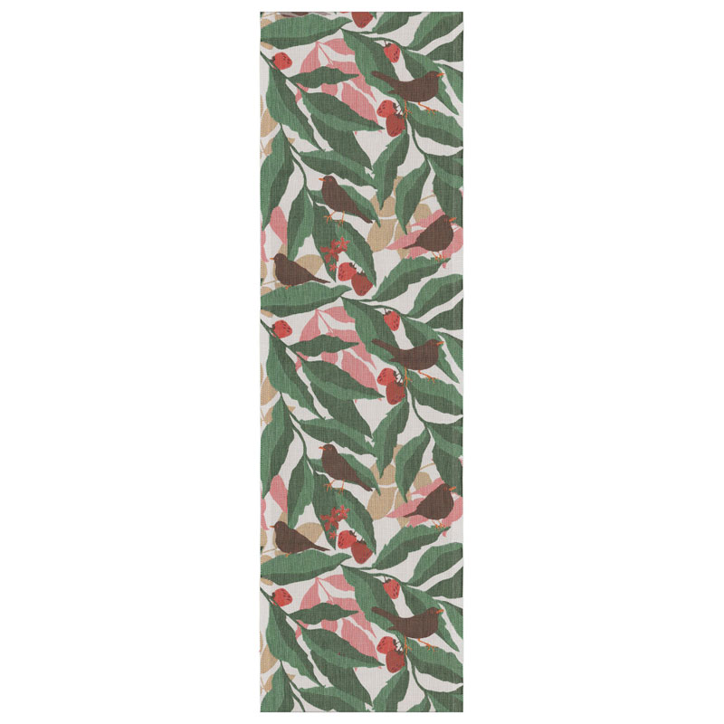 Lövkvist är en charmig bordslöpare från Ekelund, med motiv av koltrastar, som sitter på grenar fyllda av blad och jordgubbar.