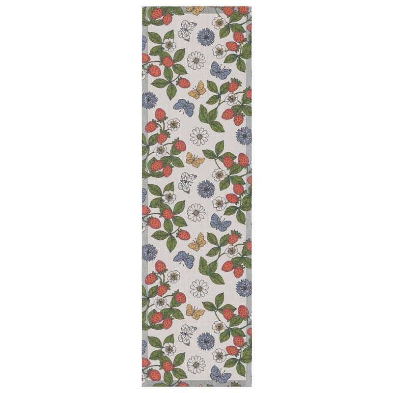 Maja är en härlig bordslöpare från Ekelund, med mönster av blommor, fjärilar och smultron mot en vit botten.