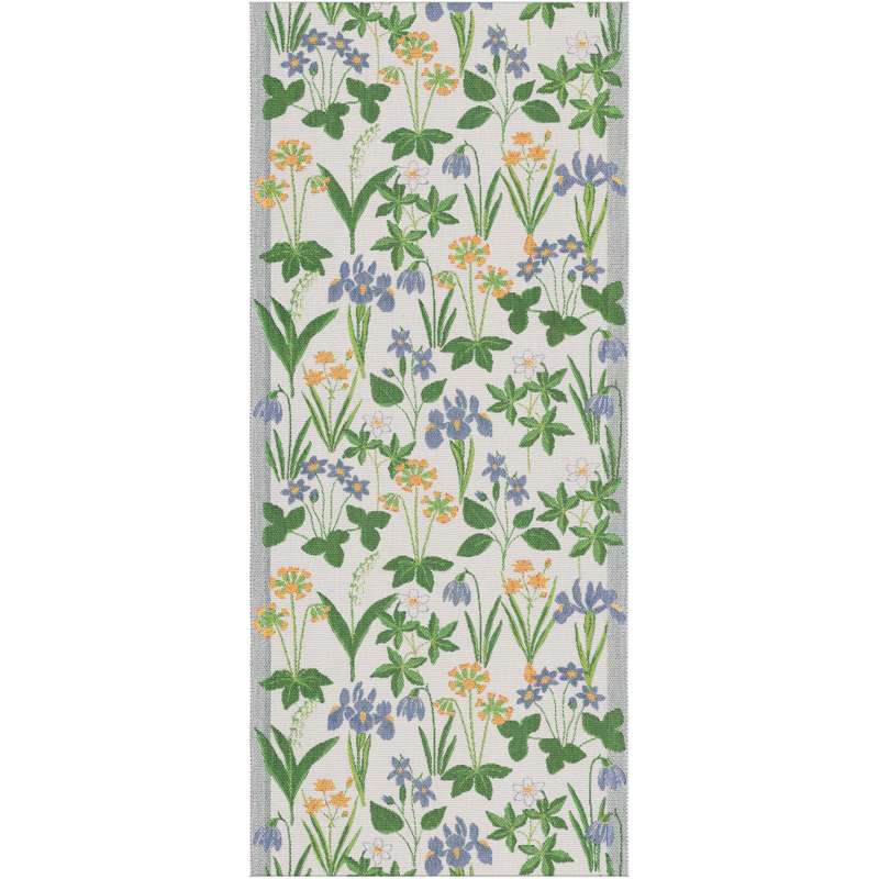 Solblå är en vacker bordslöpare från Ekelund tillverkad i 100% bomull, med en vårig design av blommor i blått och orange mot en vit botten.