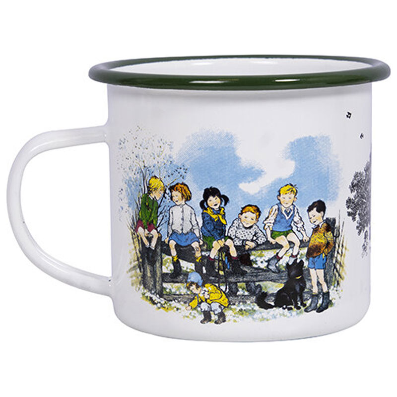 Vacker emaljmugg från Nordic Souvenir, med motiv av alla vi barn i Bullerbyn.