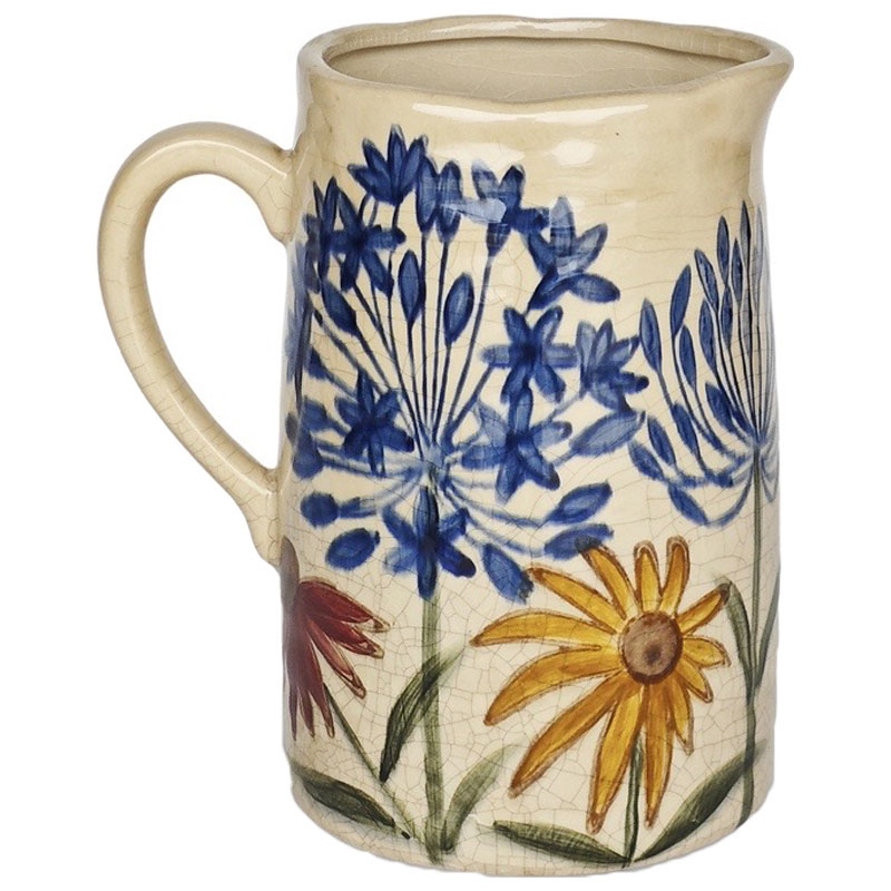 Vacker handmålad kanna/vas från Miljögården tillverkad av stengods, dess unika flerfärgade blomstermönster ger kannan en inbjudande look.