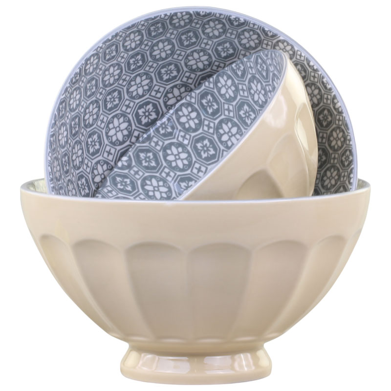 Arés 5-Set skålar i beige lamell nyans med ett fint blått blommigt rutigt mönster inuti skålen från Chic Antique.