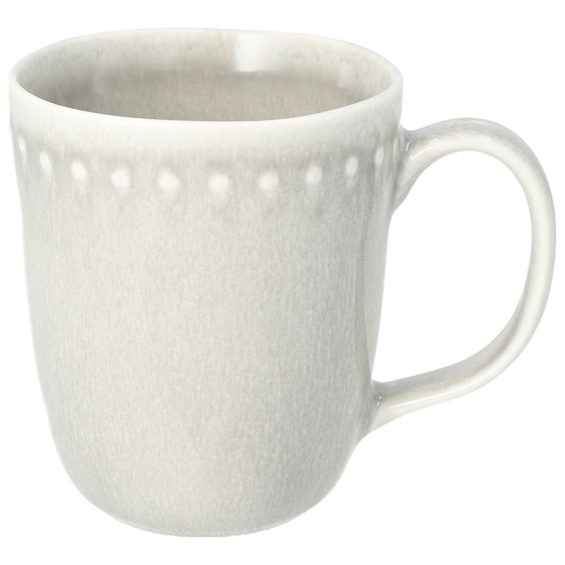 Iögonfallande kopp från A Lot Decoration, prydd av en naturvit glasyr med ljusa prickar längst kanten.