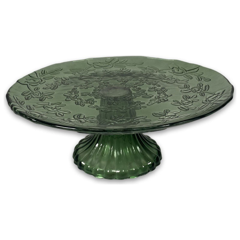 Vacker kakfat från Miljögården, tillverkad i glas prydd av ett vacker blommotiv mot en grön botten.