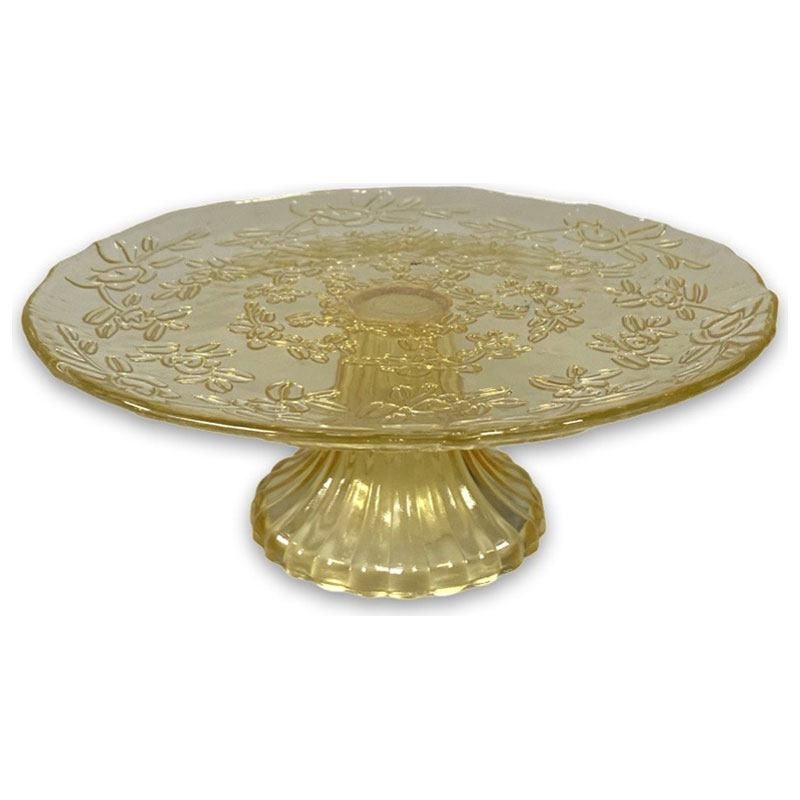 Vacker kakfat från Miljögården, tillverkad i glas prydd av ett vacker blommotiv mot en gul botten.