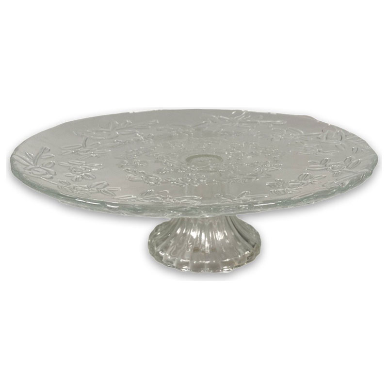 Vacker kakfat från Miljögården, tillverkad i glas prydd av ett vacker blommotiv mot en klar botten.