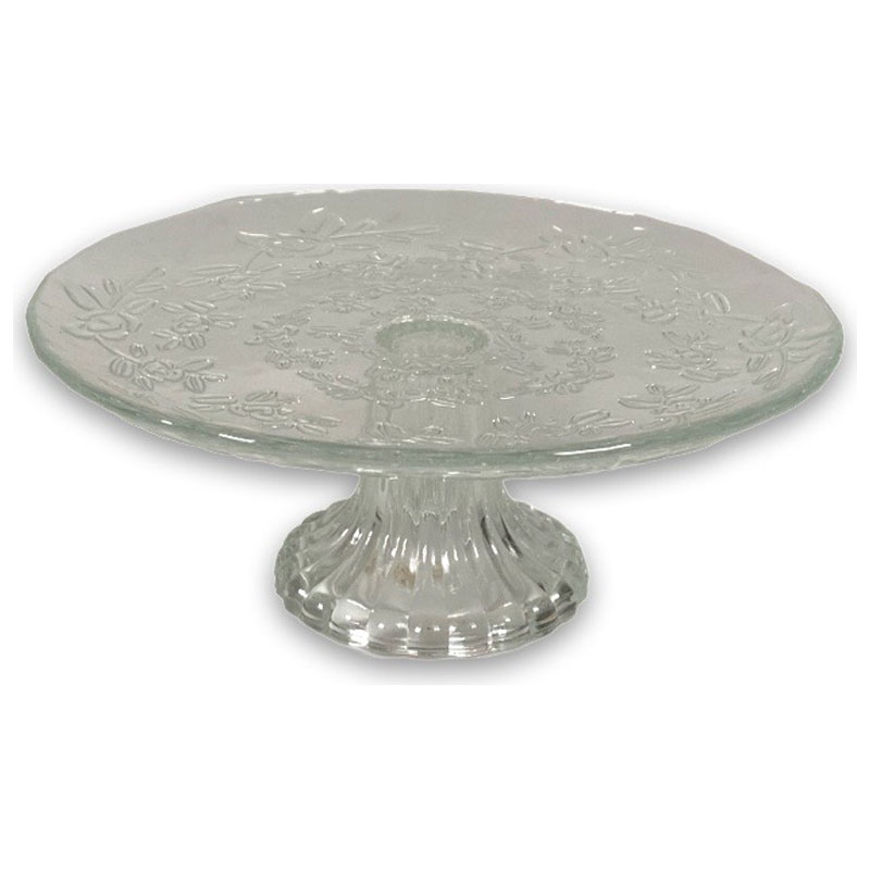 Vacker kakfat från Miljögården, tillverkad i glas prydd av ett vacker blommotiv mot en klar botten.