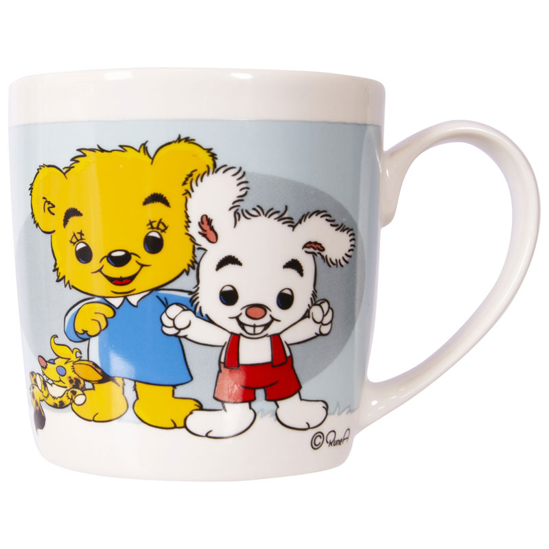 Charmig mugg från Nordic Souvenir, med härligt motiv av Brumma och Mini-Hopp tillsammans mot en blå botten.