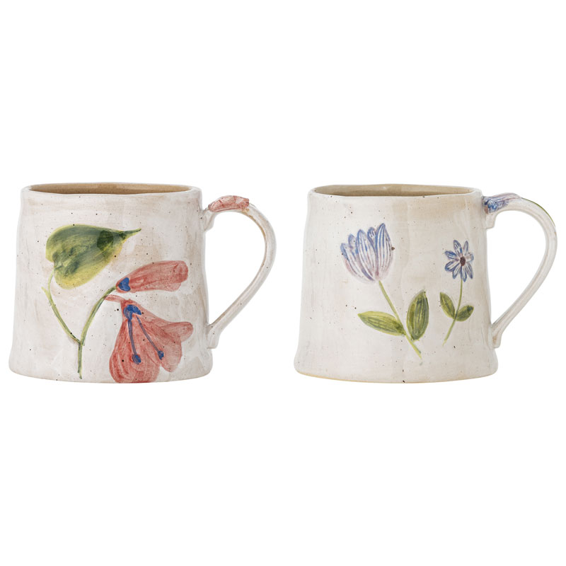Varje mugg har en mjuk beige spräcklig botten med blommiga detaljer i dämpade toner och är avslutad med en reaktiv glasyr.