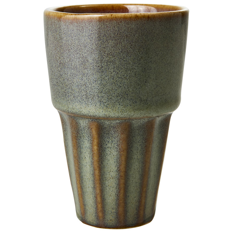 Den rustika designen och glasyren i varma nyanser gör koppen perfekt för kaffe, te eller varm choklad.