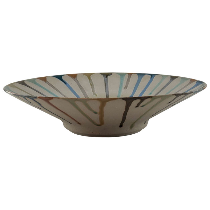 Vackert fat tillverkat i stengods från Miljögården. Med ett tjusigt mönster av rinnande färg i flera olika färger.