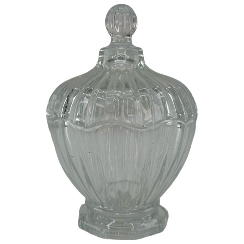 Vacker skål med lock från Miljögården, tillverkad i glas och prydd av ett romantiskt mönster i glasklart.