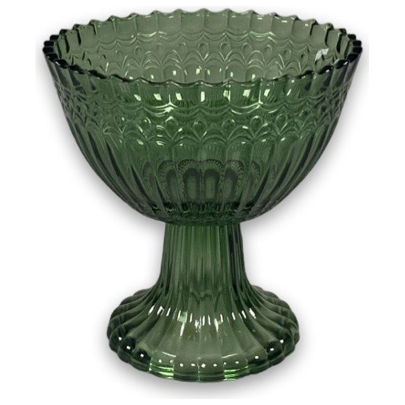 Vacker skål på fot från Miljögården, tillverkad i glas prydd av ett romantiskt mönster mot en grön botten.