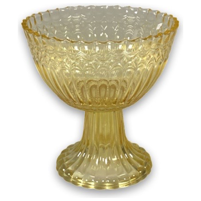 Vacker skål på fot från Miljögården, tillverkad i glas prydd av ett romantiskt mönster mot en gul botten.