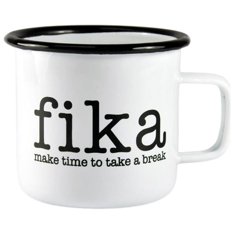 Inbjudande emaljmugg, prydd av texten "Fika, make time to take a break" i svart mot en vit botten.