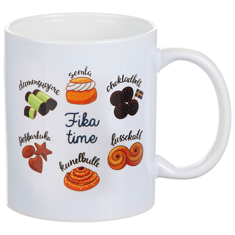 Charmig mugg från Different Design, med texten "Fika Time" och olika fika klassiker mot en vit botten.