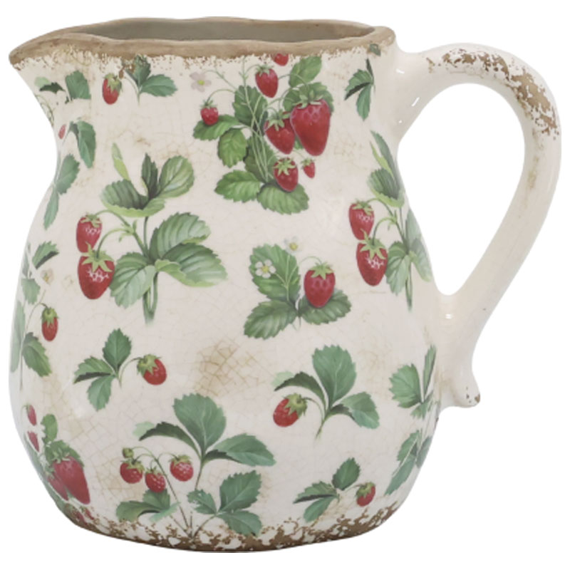Gullig kanna från Chic Antique, prydd av småmönstrade jordgubbar mot en offwhite botten.