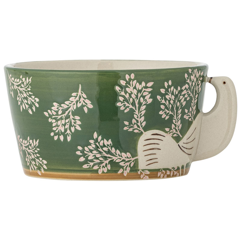 Heza från Bloomingville är en stengodsskål med en grön glasyr, med handmålade ljusrosa bladgrenar och en krämfärgad fågel som bildar handtaget.
