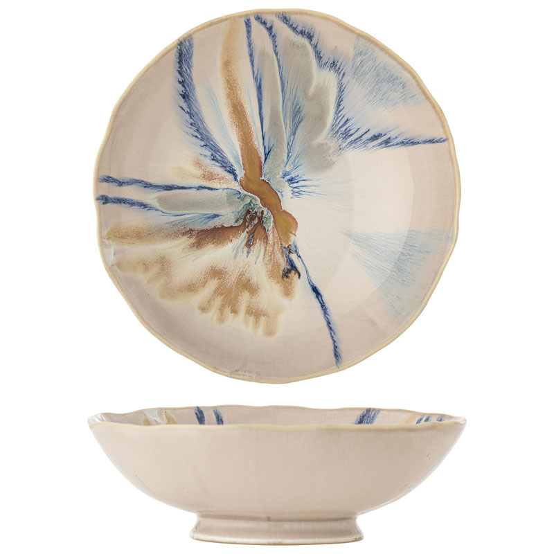 Imogen från Bloomingville är en unik skål i stengods med en reaktiv glasyr, som skapar en varierad yta i mjukt beige blandat med böljande blå och bruna accenter.