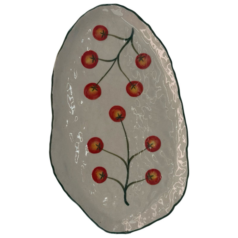 Ett tjusigt avlångt fat med ett handmålat mönster av kvisttomater, från Miljögården. Ett vacker tillskott som förgyller alla typer av dukningar med dess unika utseende.