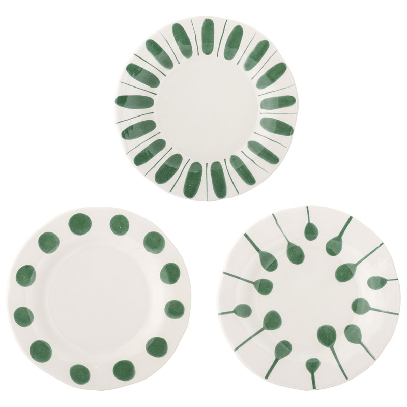 Varje assiett har en ljus bas med handmålade gröna kantmönster i prickar, streck och droppform.