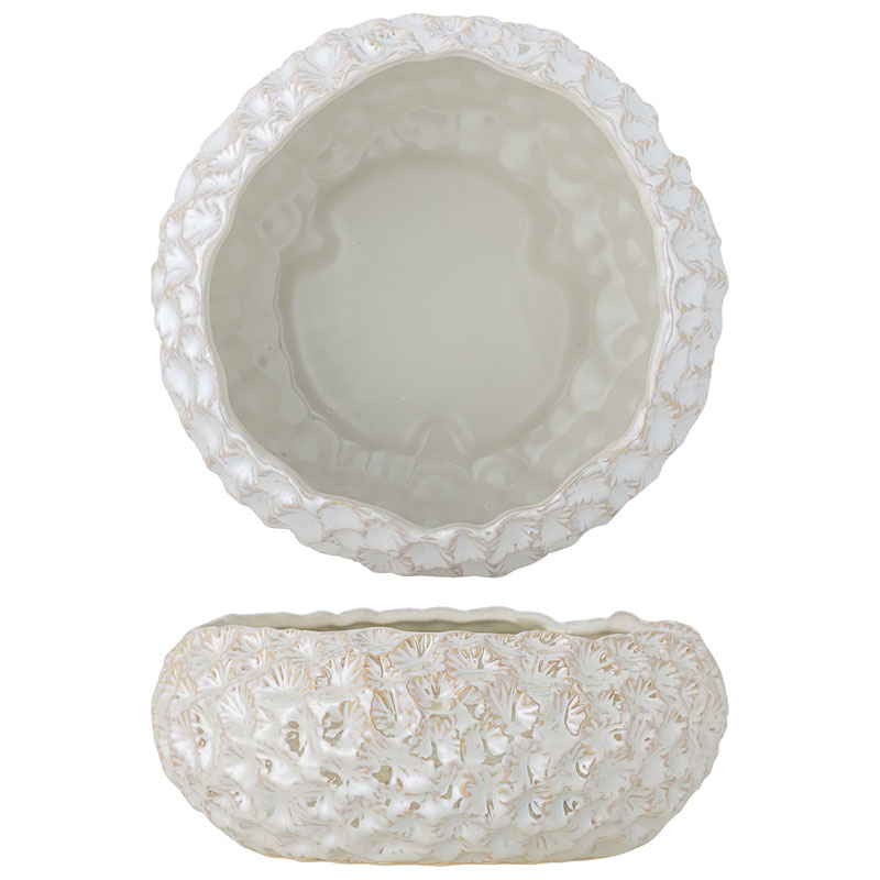 Med en skulptural, vågig kant och ett koralliknande ytmönster i mjuk beige, har skålen ett slätt vitt utseende.
