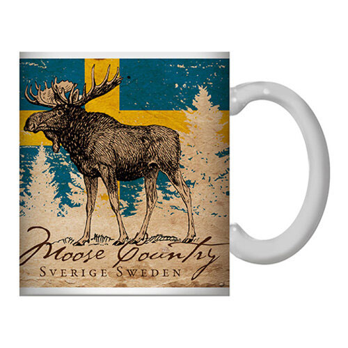 Mugg i porslin från Nordic Souvenir, med illustration av en älg och Sverige flagga.