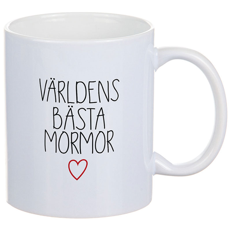 Fin mugg från Different Design. Med texten "Världens Bästa Mormor" och ett hjärta i rött. Perfekt gåva och present till mormor.