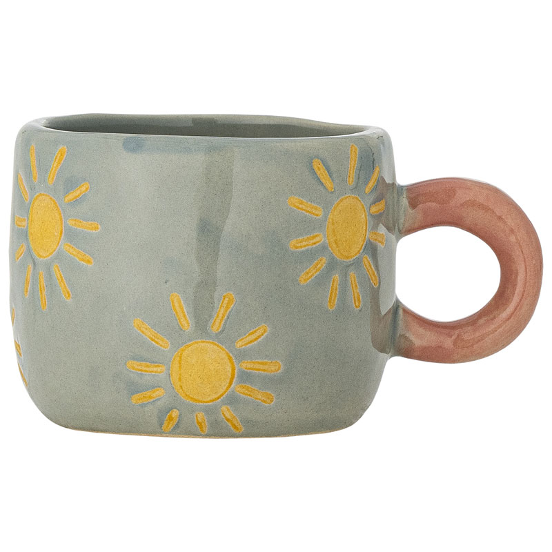 Nini från Bloomingville är en stengodskopp med solmotiv på en blå bas, kompletterad med ett runt handtag i varmrosa.