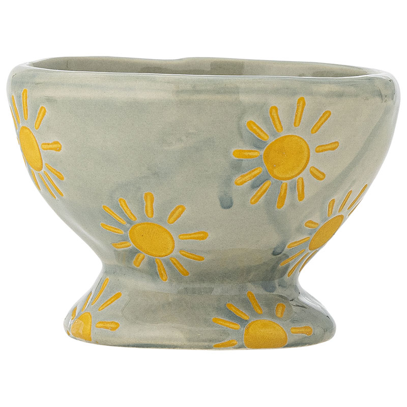 Nini från Bloomingville är en härlig stengodsskål med en handmålad finish i mjukt blått, med gula solmotiv, en böjd bad och en subtil ojämn kant.