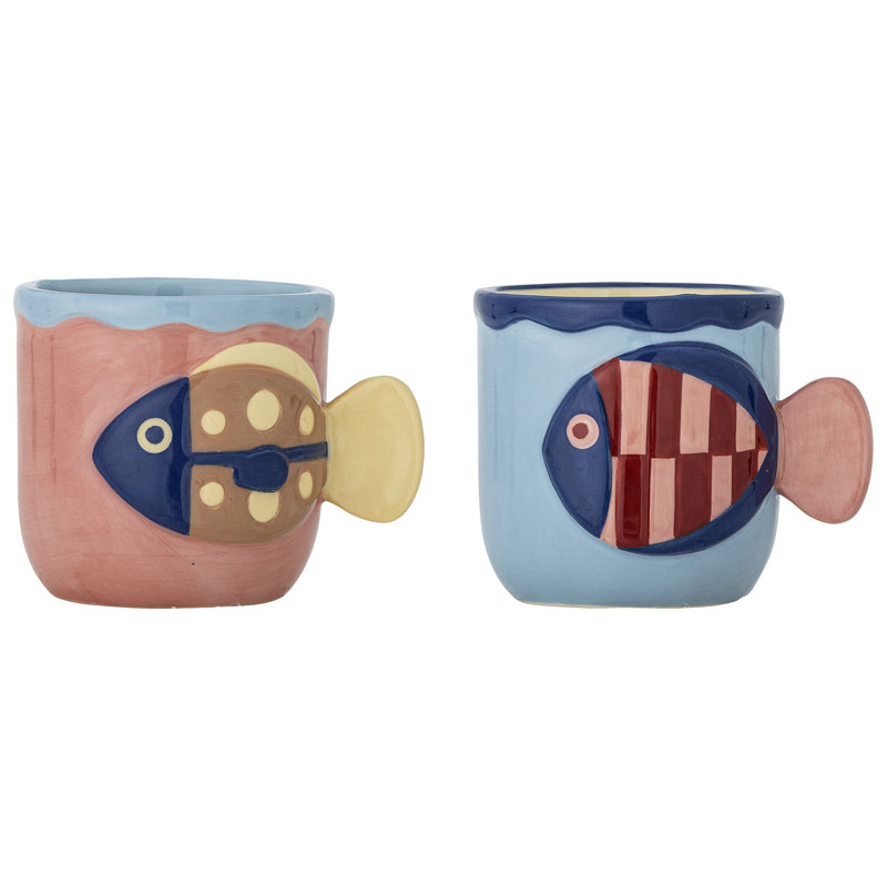 Willy är ett vackert två pack koppar i stengods från Bloomingville, med motiv av färgglada fiskar mot en rosa, respektive blå botten.