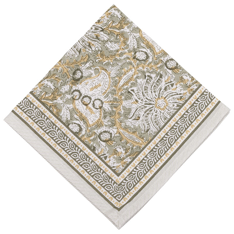 Dante från Fondaco, vacker servett med mönster i grönt och gult som tillför en stilfull och personlig touch till din dukning. Mönstret ramas in av en elegant bård med grönt bladverk.