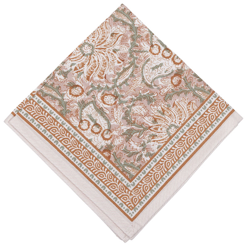Dante från Fondaco, vacker servett med mönster i rosa och grönt som tillför en stilfull och personlig touch till din dukning. Mönstret ramas in av en elegant bård med rosa bladverk.