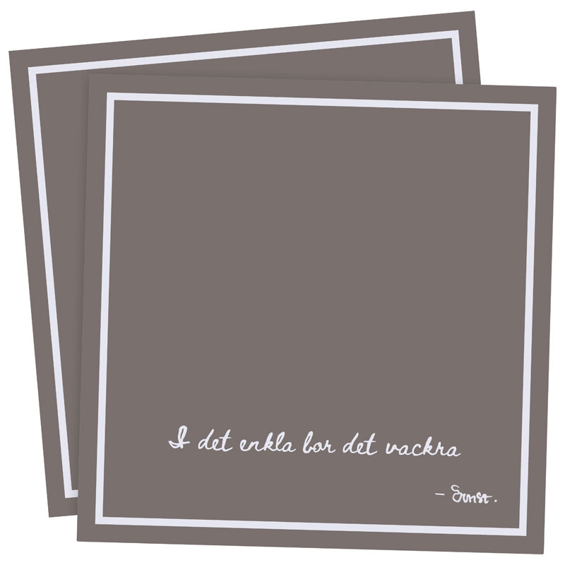 Härlig pappersservett från ERNST med en mullvadsfärgad botten, prydd av en vacker vit kant som snyggt ramar in servetten. Längst nederkanten står "I det enkla bor det vackra - Ernst".