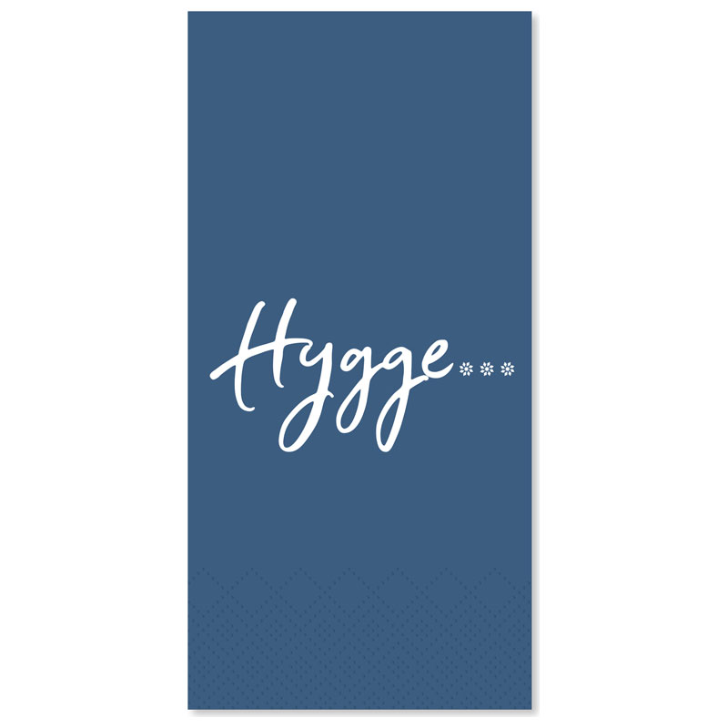 Prydd av texten "Hygge..." i vitt mot en blå botten.