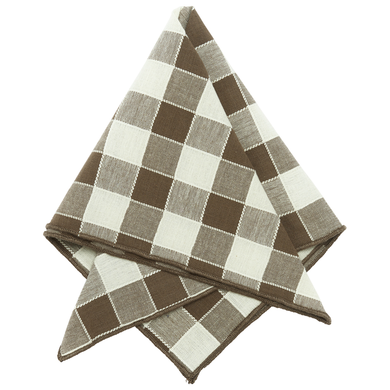 Mary från Svanefors, fin servett i tyg med garnfärgade rutor i färgerna ljusbrunt, brunt och vitt. Servetten har overlockade kanter.