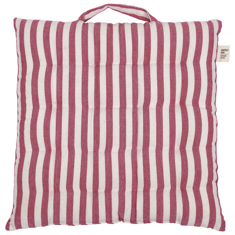 Svea från Fondaco, klassisk sittdyna i återvunnet material med tidlöst smalrandigt mönster i cerise/offwhite. Det praktiska handtaget gör den lätt att bära med sig.