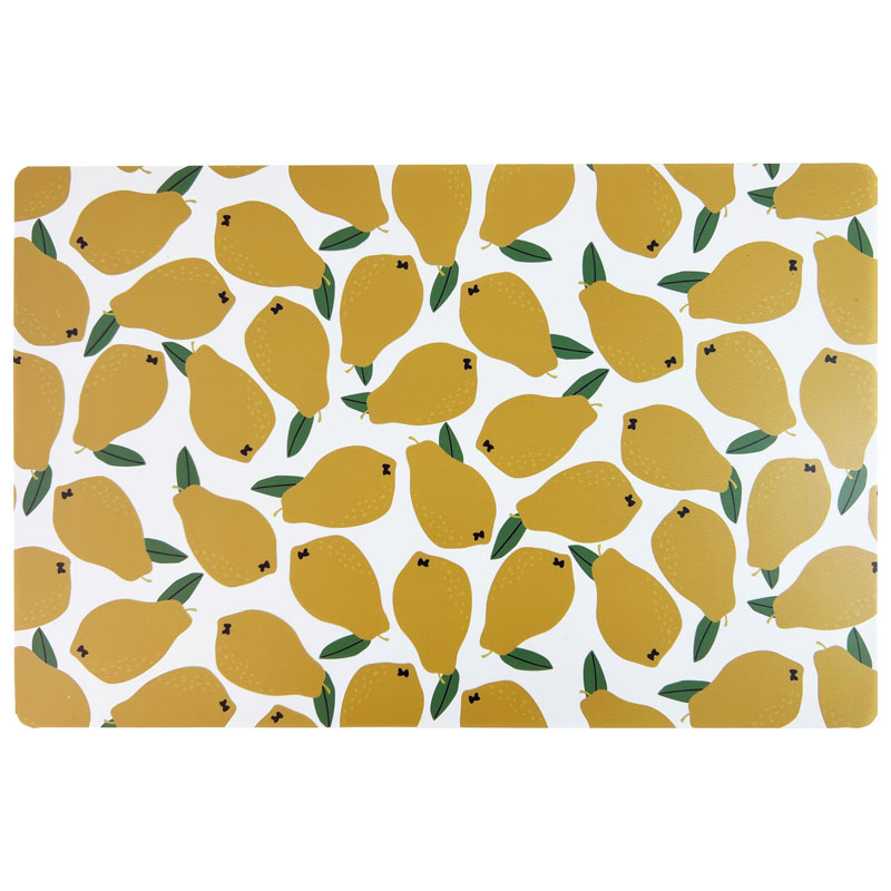 Bordstablett i plast från Redlunds med ett läckert mönster av citroner mot en ljus botten.