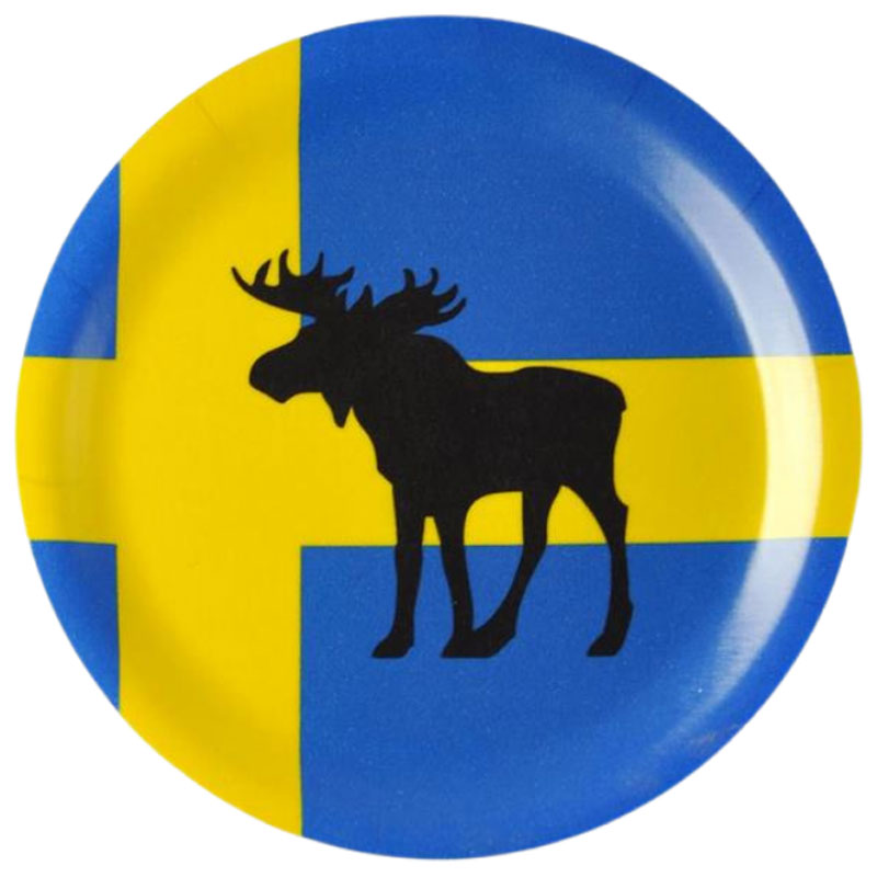 Prydd av en svart älgsiluett mot den svenska flaggan.