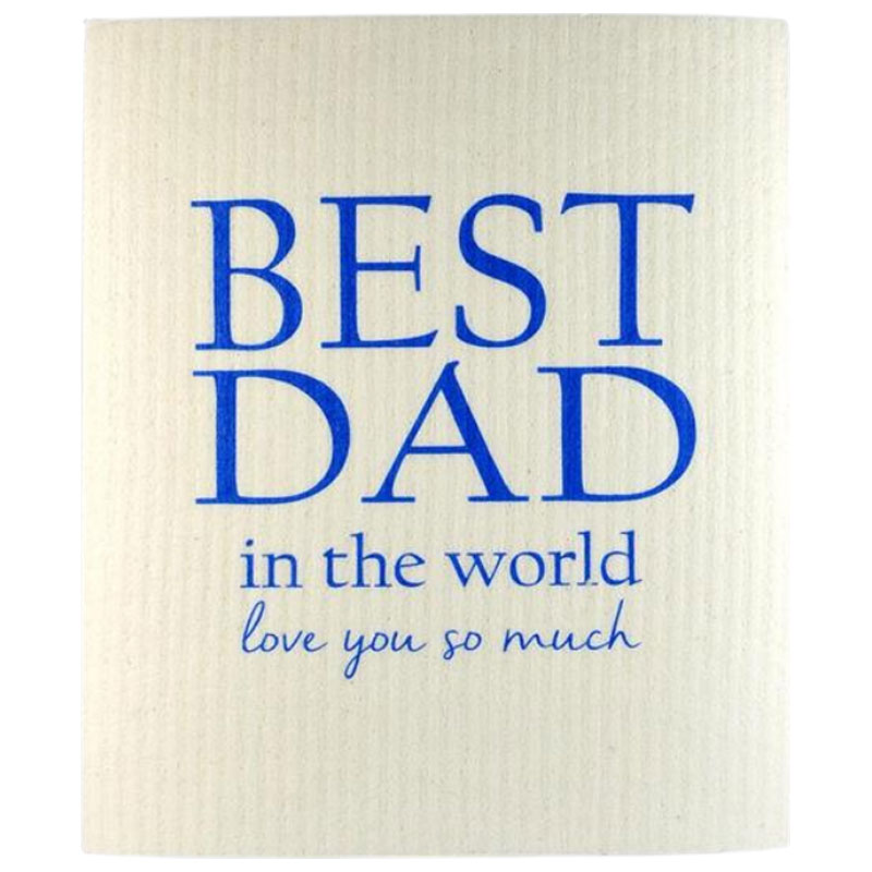 Charmig disktrasa med texten "Best Dad in the world, love you so much", i blått mot en vit botten.