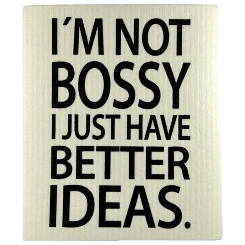 Charmig disktrasa med texten "I'm not bossy i just have better ideas.", i svart mot en vit botten.