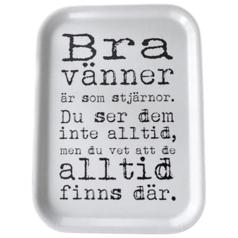 Snygg bricka med en vit botten och svart text, tillverkad av fin björkfanér.