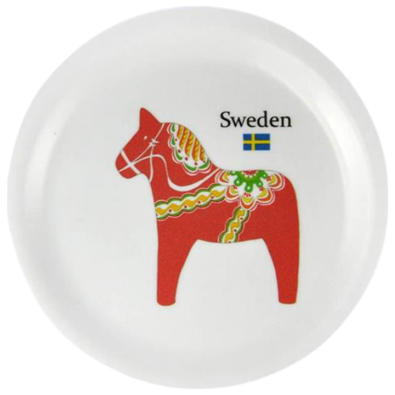 Härligt glasunderlägg med kant, prydd av en klassiskt röd dalahäst och texten Sweden ovan för den svenska flaggan.