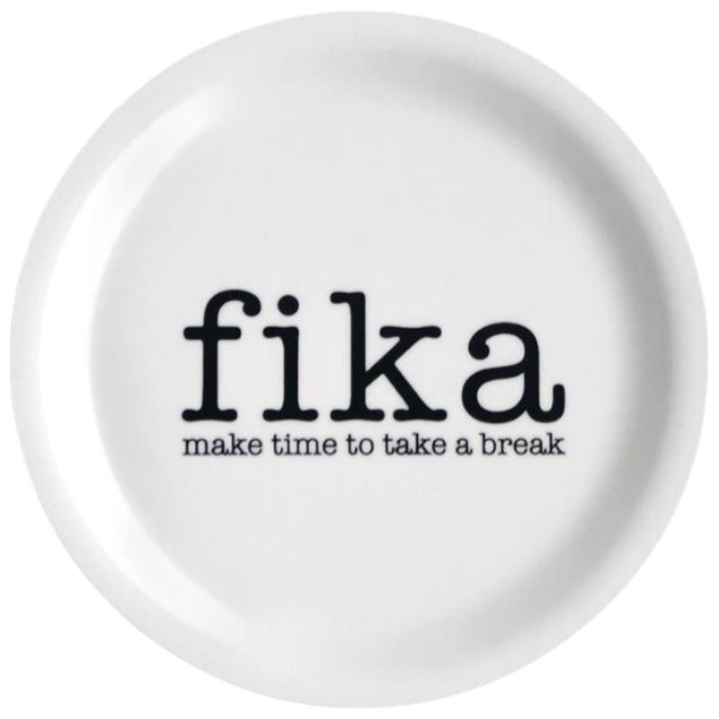 Härligt glasunderlägg med kant, prydd av texten "Fika, make time to take a break" i svart mot en vit botten.
