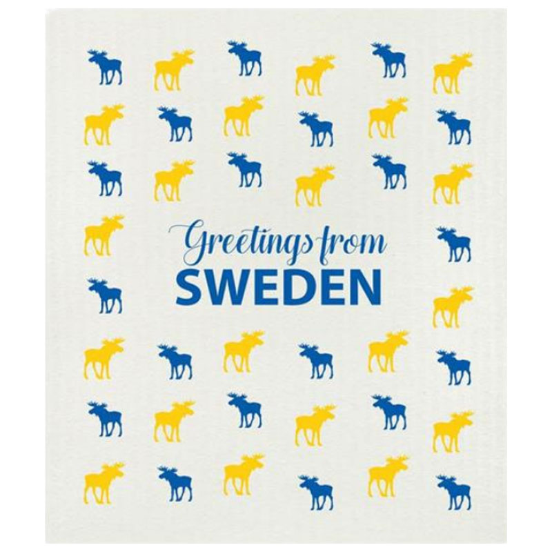 Vackert disktrasa pryd av småmönstrade älgar i vitt och blått mot en vit botten. Mitten pryds av texten "Greetings from Sweden" i blått.
