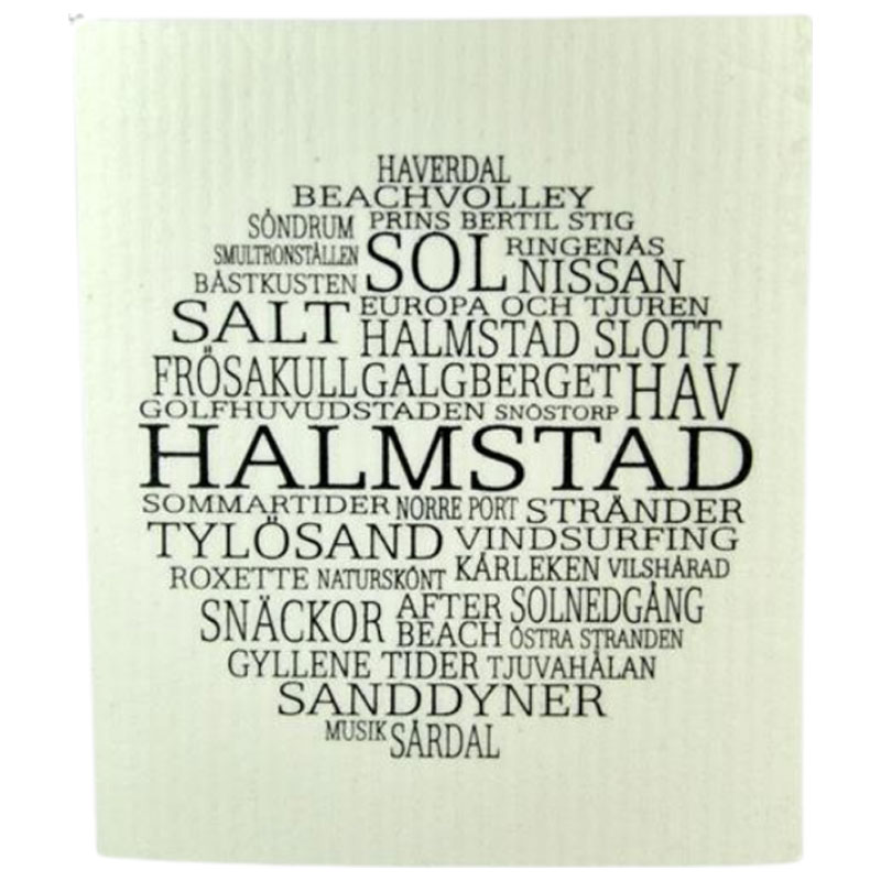 Charmig disktrasa med texten "Halmstad" omringat av mindre ord som beskriver staden, i svart mot en vit botten.