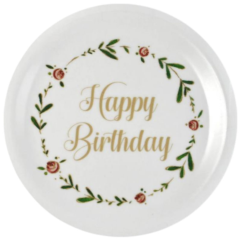 Härligt glasunderlägg med kant, prydd av texten "Happy Birthday" i guld omringad av en blomkrans.