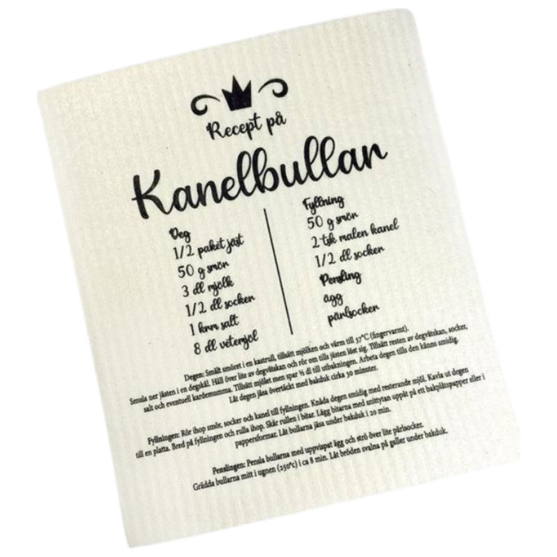 Charmig disktrasa, pryd av ett recept för kanelbullar med svart text. Perfekt att ge bort i present till någon som tycker om att baka.